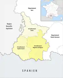 In 1800 the arrondissements of Tarbes, Argelès-Gazost and Bagnères-de-Bigorre were established. The arrondissement of Argelès-Gazost was disbanded in 1926, and restored in 1942.[3] In January 2017 13 communes passed from the arrondissement of Tarbes to the arrondissement of Bagnères-de-Bigorre.[4]