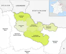 - Arrondissement of Thionville, (subprefecture: Thionville) with 104 communes.[3] The population of the arrondissement was 266,506 in 2016.
