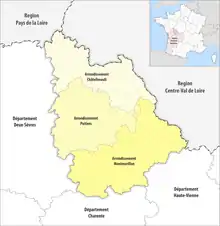 - Arrondissement of Poitiers, (prefecture of the Vienne department: Poitiers) with 83 communes.[3] The population of the arrondissement was 259,699 in 2016.