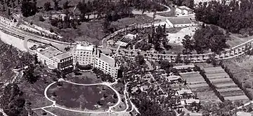 The Arrowhead Springs Hotel opened in 1939 as a resort hotel in San Bernardino Mountains. It became a popular spot for Hollywood guests. Above the resort on a near by hill is an arrowhead-shaped natural landmark, thus the name. The report was designed by African American architect Paul R. Williams and Gordon Kaufmann in the art deco style. The land was home to the Yuhaaviatam clan of the Serrano people before the resort opened. Before the resort the spot was a small tuberculosis sanitarium center that had a natural steam cave and mud baths that opened in 1864. A 1886 fire bunt down the sanitarium building. A new hotel was built in 1905 and at the same time, the Arrowhead Springs Company was founded selling bottled spring water, Arrowhead Springs water. In 1938 the resort was sold to Hollywood group: Jay Paley, Joseph M. Schenck, Constance Bennett, Al Jolson, Darryl Zanuck and Claudette Colbert for $800,000. A 1938 fire burnt down this second resort. The group spent $1.5 million and built the current resort. The main building is four-story with two wings the center also had 10 bungalows. The interior was designed by Dorothy Draper of New York. Hollywood guests included Charlie Chaplin, Judy Garland, and Clark Gable. Bugsy Siegel was a regular guest also. The resort was used for filming movies, including Humphrey Bogart in High Sierra in 1941. The US Navy leased the resort hotel on 7.5-acre and turned it into a 149 room hospital that opened in June of 1944, also called Naval Special Hospital, Arrowhead Springs. It was opened to help with the overcrowing at US Naval Hospital Corona. In June 1944, 500 patients were transferred from Corona to Arrowhead Springs. At the end of the war, in November 1945, when the Hospital closed over 5800 troops had been cared for at the Hospital. After the war it returned to a resort hotel. Esther Williams made a movie, Thrill of a Romance in 1945. In 1946, the resort was purchased the Hull group of Chicago. Then in 1946, sold to Conrad Hilton for $2 million. In 1950 Elizabeth Taylor and Nicky Hilton honeymooned at the resort. Sold again in 1951 to Hilton Hotel, then to Campus Crusade for Christ in 1961. Campus Crusade for Christ moved to Orlando, Florida in 1991. In March of 1992, the resort went for sale with no buyers. The resort was vacant till sold to San Manuel in 2017.[2][3][4]