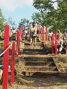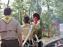 After being elected or nominated, candidates may participate in a call-out ceremony to recognize those Scouts and Scouters that were selected before they attend their Ordeal. The call-out ceremony may be performed at summer camp, a camporee, a call-out weekend or at a unit meeting. Candidates subsequently participate in an Ordeal, intended to emphasize service and selflessness. During the induction, "candidates maintain complete silence, receive small amounts of food, work on camp improvement projects, and are required to sleep alone, apart from other campers, which teaches significant values."[35] If they succeed in their ordeal the candidates are then welcomed as Ordeal members in a formal Ordeal Ceremony.[37][38]
