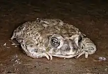 The arroyo toad is a stocky, blunt-nosed, warty-skinned species of toad, 5 to 7.5 cm (2.0 to 3.0 in) long. It has horizontal pupils, and is greenish, grey or salmon on the dorsum with a light-colored stripe across the head and eyelids. It has light sacral and mid-dorsal patches, large, oval and widely separated parotoid glands, and weak or absent cranial crests. The juvenile of this species are ashy-white, olive or salmon on the dorsal side, with or without black spotting. It has red-tipped tubercles on its back.[3]