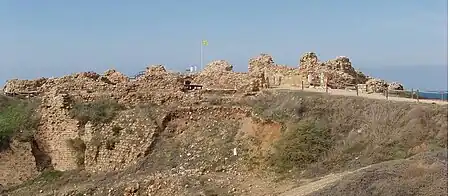Apollonia (Ancient Greek: Ἀπολλωνία; Hebrew: אפולוניה), known in the Early Islamic period as Arsuf (Arabic: أرْسُوف, romanized: Arsūf) and in the Crusader Kingdom of Jerusalem as Arsur, was an ancient city on the Mediterranean coast of today's Israel. In Israeli archaeology it is known as Tel Arshaf (תֵּל אַרְשָׁף). Founded by the Phoenicians during the Persian period in the late sixth century BCE, it was inhabited continuously until the Crusader period,[1] through the Hellenistic, Roman, and Byzantine periods, during the latter being renamed to Sozusa (Ancient Greek: Σώζουσα, or Sozusa in Palaestina to differentiate it from Sozusa in Libya).[2] It was situated on a sandy area ending towards the sea with a cliff, about 34 kilometres (21 mi) south of Caesarea.