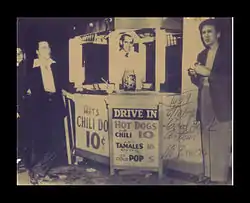 Art Elkind, a chemical engineer, turned to selling hot dogs when unable to find work during the Great Depression. Art's Famous Chili Dogs opened in 1939, about two miles west of its current location.[1] In 1944, it moved to its current location at Florence Avenue and Normandie Avenue. The first place at this intersection where Art had a stand was about 20 feet north of Florence, and on the east side of Normandie, in the 1950s he moved to the other location. Art Elkind claims to have invented the chili dog when he was selling hot dogs and chili from a pushcart when someone suggested that he combine the two (other hot dog vendors have disputed this legend). Art Elkind invented his own hot dog steamer, which kept all of hot dog's ingredients at the same temperature and for using a hot dog which was only part pork and had no natural casing, which contributed to his chili dogs' unique flavor.[2]