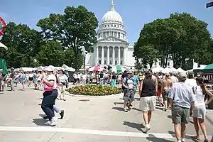 Art Fair on the Square is an annual event held on the Capitol Square in Madison, Wisconsin, United States. The juried event brings together around 500 artists from across America on the second weekend of July. Most art forms are represented, including ceramics, glass, fibre arts, photography, graphic arts, sculpture, woodwork, metals and jewellery, as well as the traditional paint and print media. It has been one of the most popular events in Madison for 50 years, drawing an estimated 200,000 people each year, including artists, students, families and casual browsers.[1] The event is organised by the Madison Museum of Contemporary Art (MMoCA) and serves as its primary fund-raising event.[2] A virtual event was planned in 2020 as officials cited COVID-19 pandemic as cause.[3]