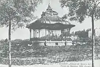 1923 | Based on a neo-rococo approach, which reflects the modernist currents of the time, Luis Bellido González conceives a large roof supported by sixteen fine iron columns, paired into eight groups. Its inauguration takes place on May 15, 1923, with a concert of Spanish popular music, offered by the Municipal Symphony Band of Madrid and the Choral Association, under the direction of Ricardo Villa.[42] The kiosk was located on an artificial esplanade, at the confluence of Paseo del Pintor Rosales with Calle del Marqués de Urquijo, next to Parque del Oeste, where it remained until 1951, when it was demolished. | ![]() |