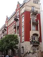 Art Nouveau houses (multi-story buildings and villas), department stores, and other public buildings such as a concert hall, and a church, were built in the years 1898–1910 in the Neustadt district, the Neudorf district, the historic city center, and in the Krutenau district. Most of these have survived World War II and the changes of taste, and many are classified as Monuments historiques. The most notable architects were the associates Franz Lütke (1860–1929) and Heinrich Backes (1866–1931); Jules (Julius) Berninger (1856–1926) and Gustave (Gustav) Krafft (1861–1927); Joseph Müller (1863–??) and Richard Kuder; David Falk (1875–1949) and Émile Wolf (1874–??); Auguste Mossler (1873–1947) and Auguste Müller (1863–1936), as well as the unaffiliated Fritz Beblo, Auguste Brion (1861–1940), Samuel Landshut (1860–1919), Waldemar Osterloff, and Aloys Walter (1869–1926).[1][2][3]