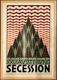 The Vienna Secession was movement with a very different aesthetic and style from the Belgian and French Art Nouveau. The sinuous lines and floral designs of the early style were largely replaced by geometric patterns and symmetry. The painter Gustav Klimt made a venture into graphic arts, designing the poster for the Secession Exhibition of 1898. The major graphic artists of the Secession included Joseph Maria Olbrich, who designed posters for the exhibitions of the Secession, and also designed the gilded cupola for the Secession's gallery in central Vienna.