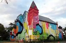Blind Whino is a non-profit organization located in a once defunct and abandoned building, Friendship Baptist Church, nestled in the heart of southwest Washington D.C. Purchased in October 2012 as a branch of the Art Whino Gallery, Blind Whino is a 15,000 sq. ft. property renovated with the intention to provide the community with an art inspired environment for both learning and creating within the arts culture.[8] The exterior and interior of the now completed space was designed by renowned artist HENSE from Atlanta, Georgia and MEGGS from Australia.[9] For over two decades, the former Friendship Baptist church had been vacant. The transformation process began in the fall of 2012 restoring the church from its previously peeling white paint to a brightly multi-colored building. Designed to host a variety of events, Ian Callendar, co-founder of the Blind Whino along with Shane Pomajambo stated, "Here’s a space where anything can happen — theater, music, supper club, jazz, anything that you can imagine." Working on the land outside of the Blind Whino is non-profit organization, Dreaming Out Loud, helping restore it for community utilization.[10]