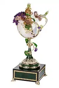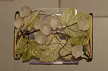 In the United States, arts and crafts jewelry was popular with amateurs, since unlike ceramics, furniture or textiles, it required only a modest investment in tools, and could be made in the kitchen.[13] One of the first American arts and crafts jewelers, Madeline Yale Wynne, was self-taught and approached her jewelry as form and composition with the emphasis on aesthetic qualities rather than skill, stating that "I consider each effort by itself as regards color and form much as I would paint a picture."[14] Brainerd Bliss Thresher, another American arts and crafts jeweler, used materials like carved horn and amethyst for their aesthetic qualities, following the example of René Lalique who mixed quotidian and precious materials in his jewelry. As Janet Koplos and Bruce Metcalf suggest, whereas the British Arts and Crafts movement tried to reunite art and labor, many upper-class Americans like Thresher united art and leisure: "The practice of craft as a recreation could be a relief from the pressure of a difficult job, a demonstration of one's good taste and savor vivre, a polite manifestation of progressive politics, or an expression of the sheer pleasure of satisfying labor."[15]