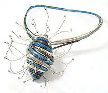 Art historian Liesbeth den Besten has identified six different terms to name art jewelry, including contemporary, studio, art, research, design, and author,[1] with the three most common being contemporary, studio, and art. Curator Kelly L'Ecuyer has defined studio jewelry as an offshoot of the studio craft movement, adding that it does not refer to particular artistic styles but rather to the circumstances in which the object is produced. According to her definition, "Studio jewelers are independent artists who handle their chosen materials directly to make one-of-a-kind or limited production jewelry..... The studio jeweler is both the designer and fabricator of each piece (although assistants or apprentices may help with technical tasks), and the work is created in a small, private studio, not a factory."[2] Art historian Monica Gaspar has explored the temporal meaning of the different names given to art jewelry over the past 40 years. She suggests that "avant-garde" jewelry positions itself as radically ahead of mainstream ideas; "modern" or "modernist" jewelry claims to reflect the spirit of the times in which it was made; "studio" jewelry emphasizes the artist studio over the craft workshop; "new" jewelry assumes an ironic stance towards the past; and "contemporary" jewelry claims the present and the "here and now" in contrast with traditional jewelry's eternal nature as an heirloom passing between generations.[3]