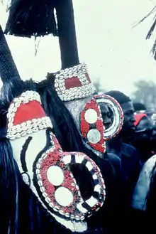 In the southwest masks represent animals such as antelope, bush buffalo, and various strange creatures, are painted red, white and black. In the east, around Boulsa [3], masks have tall posts above the face to which fiber is attached, . Female masks have two pairs of round mirrors for eyes,