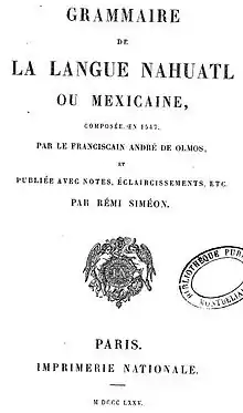 - Andrès de Olmos (1875), Grammaire de la langue Nahuatl ou Mexicaine, Paris: Impr. Nationale