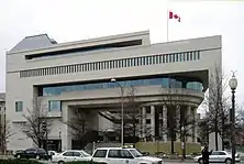The personal selection of Arthur Erickson as the architect for the Canadian Chancery in Washington, DC by then-Prime Minister Pierre Trudeau was controversial, because Trudeau and Erickson were close friends and the Prime Minister overruled the objections and choices of the embassy's design committee.[20] Erickson's biographer Nicholas Olsberg described the building as "making fun of the ridiculous terms to which buildings must adhere in Washington... mocking the US and all of its imperial pretensions."[21] In fact, Erickson had to obey his client's instructions, which were to express neighbourliness, openness and friendship, while adhering to the restrictions put in place by the 20 committees which regulate what happens on Pennsylvania Avenue. He blended the Neoclassicism of existing structures with the idiom of the Plantation house to create an expanse of space. Oberlander landscaped the courtyard with northern plants; Erickson had Haida artist Bill Reid create the massive sculpture Spirit of Haida Gwaii, the Black Canoe, which sits in the courtyard in a pool of water.[14] While his detractors may have had initial doubts about his ability to create a structure which represented Canada, it is this building which won Erickson the AIA Gold Medal.