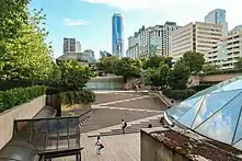 Built in Vancouver in 1979 as a large civic center, Erickson’s design included waterfalls, a roof garden, several plazas, and stairs with ramps integrated within. This complex is one of the few in North America that integrates everything from public space and landscape to a set of surrounding buildings, spanning from the art gallery to the law courts. As time goes on, more additions are being created that seem to contrast the original intent of the design. Glass barriers were installed near the waterfall, preventing people from getting close to it, as well as on the edges of planters to prevent people from being able to sit on them. It has also since lost the outdoor restaurants, cinema, and large auditorium that once existed on the site.[17] On the design of the roof garden, Erickson was assisted by his former student, architect Bing Thom; the landscape architect on Robson Square was Cornelia Oberlander.