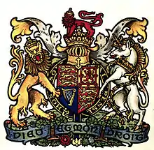 Fox-Davies bore the Davies arms with a crescent for cadency, and intended to quarter them with the Fox arms after his mother's death; but as she outlived him, dying in 1937, this was not possible.[5] He also considered obtaining grants to his wife's families of Crookes and Proctor, which would have entitled his children to additional quarterings, but at this point he no longer had the money for further grants of arms.[5] He did obtain, in 1921, the grant of a badge, which consisted of a crown vallary gules.[4] His motto was Da Fydd, Welsh for "good faith" and a pun on the name Davies.
