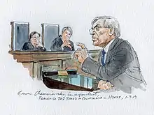 Arthur Lien is an American sketch artist best known for his work depicting the proceedings of the United States Supreme Court.[1] He began his career in courtroom sketch artistry in 1976 after graduating from Maryland Institute College of Art, and by 1978 was the Supreme Court sketch artist for CBS.[2] At the time, many news organizations had their own sketch artist on staff to cover state and federal legislatures and courts, few of which allowed cameras. In the 1980s, many legislatures and courts began to allow video recording of their proceedings. Since then the number of court sketch artists has dwindled.[2] Because the Supreme Court does not allow photography of its proceedings, Lien—along with Bill Hennessy and Dana Verkouteren—is one of the three remaining sketch artists who depicts the courtroom activities, and his sketches are used by a number of news organizations including the New York Times, NBC News, and SCOTUSblog.[2][1]