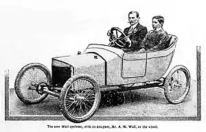 In 1912, Arthur Wall revealed his latest creation, a four-wheel cyclecar.[24] Two models were to be built with the same combination of engines as used on the Tricar. Unlike many cyclecars, the transmission was via propshaft with universal joint to a live rear axle. The twin has a two-speed (and reverse) Roc epicyclic gearbox (Roc Gear Co of Hay Mills, Birmingham was also an A.W. Walls company). A new company, Wall Cars Ltd of Tyselely, Birmingham had been created to produce the cars.