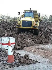 An articulated hauler, articulated dump truck (ADT), or sometimes a dump hauler, is a very large heavy-duty type of dump truck used to transport loads over rough terrain, and occasionally on public roads. The vehicle usually has all-wheel drive and consists of two basic units: the front section, generally called the tractor, and the rear section that contains the dump body, called the hauler or trailer section. Steering is made by pivoting the front in relation to the back by hydraulic rams. This way, all wheels follow the same path, making it an excellent off-road vehicle.