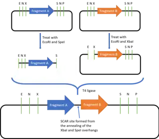 The prefix contains the restriction sites for EcoRI, NotI and XBaI, while the suffix contains the SpeI, NotI and PstI restriction sites. Outside of the prefix and suffix regions, the DNA part must not contain these restriction sites. To join two BioBrick parts together, one of the plasmids is digested with EcoRI and SpeI while the second plasmid is digested with EcoRI and XbaI. The two EcoRI overhangs are complementary and will thus anneal together, while SpeI and XbaI also produce complementary overhangs which can also be ligated together. As the resulting plasmid contains the original prefix and suffix sequences, it can be used to join with more BioBricks parts.[24] Because of this property, the BioBricks assembly standard is said to be idempotent in nature. However, there will also be a "scar" sequence (either TACTAG or TACTAGAG) formed between the two fused BioBricks. This prevents BioBricks from being used to create fusion proteins, as the 6bp scar sequence codes for a tyrosine and a stop codon, causing translation to be terminated after the first domain is expressed, while the 8bp scar sequence causes a frameshift, preventing continuous readthrough of the codons. To offer alternative scar sequences that for example give a 6bp scar, or scar sequences that do not contain stop codons, other assembly standards such as the BB-2 Assembly, BglBricks Assembly, Silver Assembly and the Freiburg Assembly were designed.[25][26][27][28]