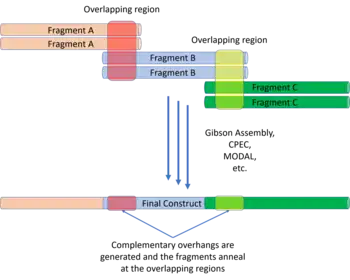 There have been a variety of long-overlap-based assembly methods developed in recent years. One of the most commonly used methods, the Gibson assembly method, was developed in 2009, and provides a one-pot DNA assembly method that does not require the use of restriction enzymes or integrases.[42] Other similar overlap-based assembly methods include Circular Polymerase Extension Cloning (CPEC), Sequence and Ligase Independent Cloning (SLIC) and Seamless Ligation Cloning Extract (SLiCE).[43][44][45] Despite the presence of many overlap assembly methods, the Gibson assembly method is still the most popular.[46] Besides the methods listed above, other researchers have built on the concepts used in Gibson assembly and other assembly methods to develop new assembly strategies like the Modular Overlap-Directed Assembly with Linkers (MODAL) strategy, or the Biopart Assembly Standard for Idempotent Cloning (BASIC) method.[47][48]