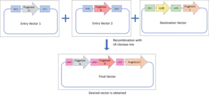 - The destination vector also comes with a Gateway cassette, but is instead flanked by a pair of attR sites. Mixing this destination plasmid with the entry clones and the LR clonase mix will allow for recombination to occur between the attR and attL sites. A destination clone is produced, with the fragment of interest successfully inserted. The lethal gene is inserted into the original vector, and bacteria transformed with this plasmid will die. The desired vector can thus be easily selected.