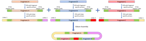 The MODAL strategy defines overlap sequences known as "linkers" to reduce the amount of customisation that needs to be done with each DNA fragment. The linkers were designed using the R2oDNA Designer software and the overlap regions were designed to be 45 bp long to be compatible with Gibson assembly and other overlap assembly methods. To attach these linkers to the parts to be assembled, PCR is carried using part-specific primers containing 15 bp prefix and suffix adaptor sequences. The linkers are then attached to the adaptor sequences via a second PCR reaction. To position the DNA fragments, the same linker will be attached to the suffix of the desired upstream fragment and the prefix of the desired downstream fragments. Once the linkers are attached, Gibson assembly, CPEC, or the other overlap assembly methods can all be used to assemble the DNA fragments in the desired order.