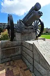 Artillery Memorial, Cape Town was erected in memory of the gunners who fought for South Africa during World War I. The memorial, which forms part of the Delville Wood Memorial, is located in the Company's Garden, Cape Town, and was strategically established to commemorate South Africa's artillery soldiers who fell in battle.[1] Of those who volunteered to fight during the war, 5800 were white South African, amongst whom 15% were Dutch and 85% English. An estimated 2536 of these men were killed in the Deville Wood battle in Europe. The Artillery Memorial, an authentic cannon facing east towards the National Gallery, proudly honors South Africa's heavy artillerymen. Inscribed on it are the names of the officers, N.C.O.'s and men of the South African artillery who fell in the Great War (1914–1918).[2]