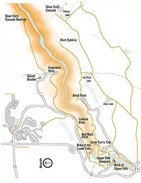 Artist Point is an overlook point on the edge of a cliff[2] on the south rim of the Grand Canyon of the Yellowstone in Yellowstone National Park, Wyoming. The point is located east-northeast of Yellowstone Falls on the Yellowstone River. Artist Point was originally named in 1883 by Frank Jay Haynes who improperly believed that the point was the place at which painter Thomas Moran sketched his 1872 depictions of the falls. Later work determined that the sketches were made from the north rim, but the name Artist Point stuck.[3]