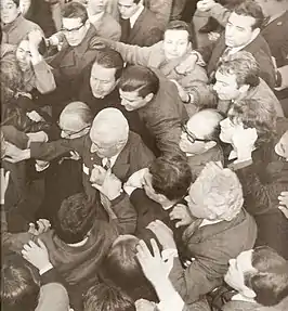 Illia started his presidency with an attempt to promote reconciliation and stability. His inaugural address included both praise for the armed forces and a call to reduce poverty and income inequality, citing encyclicals issued by then-Pope John XIII, Mater et Magistra and Pacem in Terris.[8] Countering military objections, however, he made political rights an early policy centerpiece with an emphasis on constitutionality. His first act consisted in eliminating all restrictions over Peronism and its allied political parties, causing anger and surprise among the military (particularly the right-wing "Red" faction). Political demonstrations from the Peronist party were forbidden after the 1955 coup, by the Presidential Decree 4161/56, however, five days after Illia's inaugural, a Peronist commemorative act for the 17 October (in honor of the date in 1945 when labor demonstrations propelled Perón to power) took place in Buenos Aires' Plaza Miserere without any official restrictions.