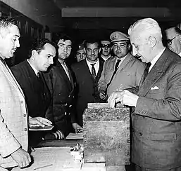 In the electoral college on 31 July 1963, the Illia-Perette ticket obtained 169 votes out of 476 on the first round of voting (70 short of an absolute majority), but the support of three centrist parties on the second round gave them 270 votes, thus formalizing their election.[7]