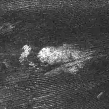 Arwen Colles: radar image by Cassini. Thin dark streaks around are dunes.