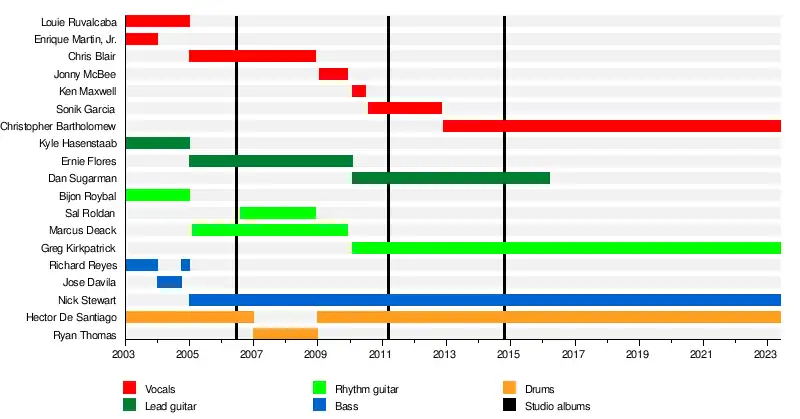 The band has gone through several lineup changes throughout its history, leaving no original members, though drummer Hector "Lech" de Santiago and bassist Nick Stewart have appeared on every studio album to date.