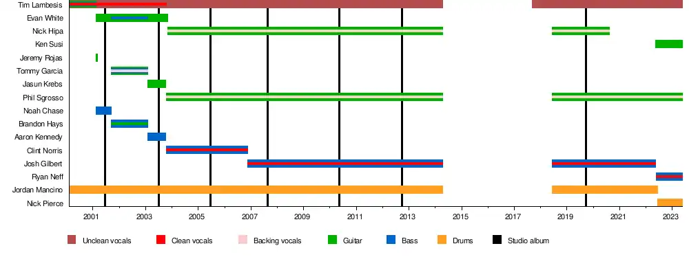 The band went on an indefinite hiatus in 2014 when Lambesis was convicted and sentenced to six years in prison for soliciting the murder of his estranged wife.[6] The remaining members formed Wovenwar with vocalist Shane Blay.[7]