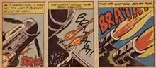 Measuring 170 cm × 430 cm (68 in × 168 in), As I Opened Fire is a triptych with verbal and temporal continuity.[2] In 1972, it was regarded as "...perhaps Lichtenstein's most ambitious exercise in strangely uniting, visually (as well as figuratively) warring elements."[3] Depicting a short few seconds during an aircraft battle, the painting is based on three panels of the original narrative which Lichtenstein has altered to improve its formal coherence.[4] This piece represents his affinity toward the high school "...highly emotional content, yet detached impersonal handling..."[5] As I Opened Fire exhibits Lichtenstein's "formal imagination". We see successive tighter views of the gun muzzles in action accompanied by an onomatopoeia, which provides cinematic flow despite the varying skies.[6] As I Opened Fire is regarded as a "very uncompromising military triptych".[7]