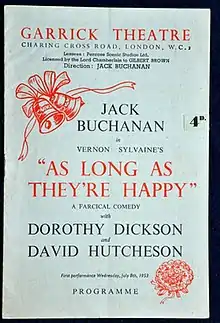 As Long as They're Happy is a comedy play by the British writer Vernon Sylvaine which was first staged in 1953. A successful hit, it ran at the Garrick Theatre in the West End for 370 performances between July 1953 and May 1954.[1] Veteran entertainer Jack Buchanan directed and starred as a stockbroker trying to cope with the extravagant behaviour of his daughters. Other members of the cast included Dorothy Dickson, Nigel Green, David Hutcheson and Stephen Hancock.[2]
