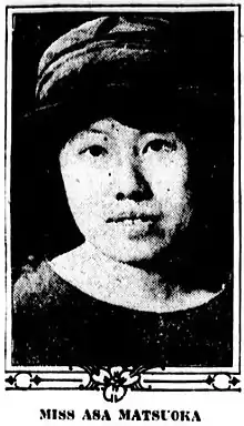 Asa Matsuoka (松岡朝, Matsuoka Asa, 1893-1980) was a Japanese philanthropist and cultural ambassador best known as the founder and first chairman of the UNICEF National Committee for Japan. She was born in Kyōbashi-ku, Tokyo (now part of Chuo-ku), on July 11, 1893, and was the first Japanese woman to earn a PhD from an American university.[1][2]