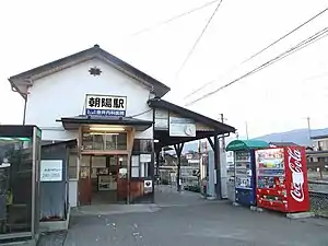 Asahi Station is a station on the Nagano Electric Railway Nagano Line. It is 6.3 kilometers from the terminus of the line at Nagano Station and 27 km from the opposite terminus at Yudanaka Station. Both the local train and Express B trains stop at Asahi Station.