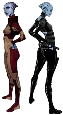 Rhodes noted that the silhouette of the asari's fringe was originally concepted as a hair style, and the final design of the species' hair fins mainly arose from the designers' experimentation with different shapes.[3] He indicated that the spiny fins hinted at the species' capability as a potential threat, as the asari would have developed over millennia of conflict and interactions with their environments.[3] The asari's fins, also described as scalp tentacles, evoke the image of a woman "emerging from the water with her hair swept back".[2] Inspiration was drawn mainly from sports-gear, such as climbing and scuba gear, particularly its "pliable, flexible" qualities.[6] After the addition of the hair fins, the asari looked more aquatic, and thus their design was altered to fit with that; this also led to the writers altering the asari home climate to be more wet.[3] Their clothing is meant to be both "alluring and sexy" while keeping a sense of "class and style", akin to a "Hollywood red carpet feel".[2] Different silhouettes of clothing were made by the design team trying to find looks that a woman would wear, which would appear both futuristic but not "too far", while also keeping with the kind of clothes that would be worn in more aquatic environments.[3]