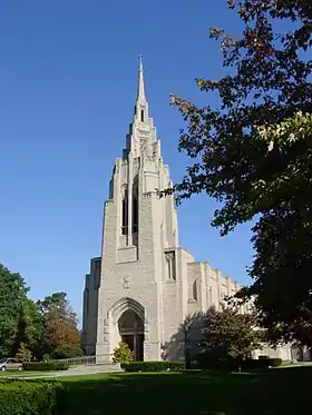 The present church building was constructed in 1953-55 in the American Gothic style. The education wing was added in 1961.[1] The stained glass windows were designed by George Haushalter.[17] The construction and style owes much to the dedication of Dr. Weldon Crossland, minister for 28 years.[18]
