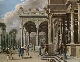 Luciano's work was originally very close to that of his presumed master Codazzi. This earned him the nickname 'Pseudo-Codazzi'.[7] There was a difference with Codazzi in that Luciano's works were more narrative and less dramatic.[8] Luciano was less concerned with accurate architectural rendering, in the tradition of quadratura. His interest lay in creating colorful effects.[2] While Luciano incorporated, like Codazzi, Bamboccianti genre elements of daily life, he softened the more realistic approach of the Bamboccianti and their indecorous aspects.[8] Luciano's style combined genre aspects with the elegance of Classicism, ennobled by sumptuous fancy architectures. His mature works anticipate 18th-century developments. It is these characteristics which attracted the attention of travelers on their Grand Tour, as it offered a mirror of the daily life in Rome while also expressing the monumentality of historic Rome.[8] Luciano also occasionally depicted in his architectural settings scenes from the Bible including The Massacre of the Innocents and Christ Expelling the Money-changers from the Temple.[2]