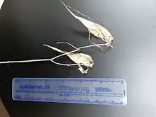 The fruit is a follicle or pod that is very slender, 8.1–14.2 centimetres (3.2–5.6 in) long and 0.6–0.8 centimetres (.25–.3 in) thick, lacking tubercles, minutely hairy to glabrous. The seeds are broadly oval with a length up to 0.8 centimetres (.3 in). They are tufted with white to tan hairs at their tips.[8]