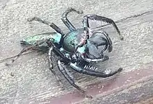 Ascyltus are a genus of jumping spiders in the family Salticidae that was first described by Ferdinand Anton Franz Karsch in 1878.[2] As of December 2020, the genus contained 10 species.[1] Ascyltus spiders utilize their vision in courtship, hunting, and navigation. They are typically large to medium-sized salticids and often move relatively slowly. However, they are capable of agile jumps when moving, hunting, or to avoid predators. They have well developed book lungs and tracheal systems, and they are capable of utilizing both systems.[3] Ascyltus have four pairs of eyes, with the anterior median pair being the most prominent. One distinguishable characteristic of the genus is their antero-lateral carapace, which is iridescently colored.[4]