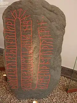 The inscription on DR 121, which is about 1.5 m (5 ft) in height and made of granite, consists of runic text in the younger futhark within a band that loops to form three rows of text. The inscription is classified as being carved in runestone style RAK, which is the classification for the oldest style where the text bands have straight ends without any attached beast or serpent heads. The runestone was discovered in 1795 at a barrow in Asferg,[1] but was still reused as a paving stone near a local mill.[2] Before the historic significance of runestones was understood, they were often reused as materials in the construction of churches, bridges, and roads. The stone was purchased by the Danish Antiquities Commission in 1810 and shipped to Copenhagen in 1825.[1] Today it is displayed at the National Museum of Denmark.