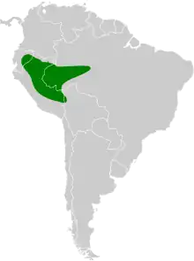 The ash-throated gnateater is found in the upper Amazon Basin in eastern Ecuador, eastern Peru, far western Brazil, and slightly into Bolivia's La Paz Department. It primarily inhabits the open understory of terra firme forest, especially vine tangles and treefalls. It can also be found in várzea forest and on slopes and ridgetops. In much of its range it is found up to 600 m (2,000 ft), but usually only up to 400 m (1,300 ft) in Bolivia and occasionally as high as 1,000 m (3,300 ft) in Peru.[2]