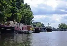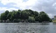 In the same way as Hampton Court, Ash Island's post town is East Molesey (KT8)[1] and the island is administratively within the London Borough of Richmond upon Thames. The main weir is at the downstream end of the island connecting to the lock; the second weir is at the upstream end and connects to the Hampton Court bank. Consequently, there is a difference of several feet in the water level surrounding the island.[2]