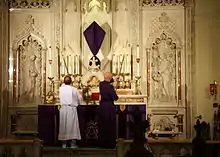 The Anglican ritual, used in Papua New Guinea states that, after the blessing of the ashes, "the priest marks his own forehead and then the foreheads of the servers and congregation who come and kneel, or stand, where they normally receive the Blessed Sacrament."[72] The corresponding Catholic ritual in the Roman Missal for celebration within Mass merely states: "Then the Priest places ashes on the head of those present who come to him, and says to each one ..."[75] Pre-1970 editions had much more elaborate instructions about the order in which the participants were to receive the ashes, but again without any indication of the form of placing the ashes on the head.[76]