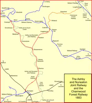 The Ashby and Nuneaton Joint Railway was a pre-grouping railway company in the English Midlands, built to serve the Leicestershire coalfield. Both the Midland Railway and the London and North Western Railway (LNWR) wished to build a line on similar alignments, and they agreed to build jointly. Construction began in 1869 and the railway was opened in 1873. It linked Moira (near Ashby-de-la-Zouch) and Coalville with Nuneaton. Mineral traffic was busy, and the line formed a useful link for through goods trains. Some long distance passenger operation took place over the line, but it was never successful in carrying passengers.