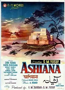 Ashiana is a 1964 Pakistani film directed by S. M. Yusuf, who co-produced it also under banner F&Y Movies. The lead cast of the film includes Zeba, Kamal, Habib, Rukhsana, Asha Posley, Nighat Sultana and Lehri.[2][3] The music was composed by A. Hameed and lyrics by Fayyaz Hashmi.