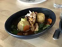 Chicken broth with kreplach (soup dumplings)